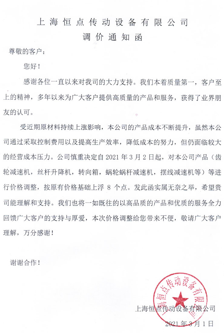 受近期原材料持續上漲影響,本公司的産品成本不斷提升,雖然本公司通過採(cǎi)取控制費用以及提高生産效率,降低成本的努力,但仍面臨較大的經營成本壓力。公司慎重決定自2021年3月2日起,對本公司産品(齒輪減速機,絲杆升降機,轉向箱 ,蝸輪蝸杆減速機,擺線減速機等)等進行價格調整,按原有價格基礎上浮8個點。發此函實屬無奈之舉,希望貴司能理解和支持。我們也将一如既往的以高品質的産品和優質的服務全力回饋廣大客戶的支持與厚愛(ài),本次價格調整給您帶來不便,敬請廣大客戶理解,萬分感謝!