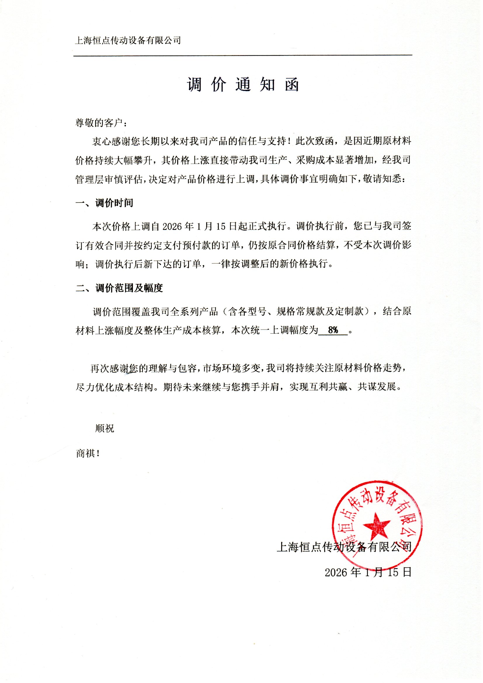衷心感謝您長期以來對我司産品的信任與支持!此次緻函,是因近期原材料價格持續大幅攀升,其價格上漲直接帶動我司生産 、採購成本顯著增加,經我司管理層審慎評估,決定對産品價格進行上調,具體調價事宜明確如下,敬請知悉: