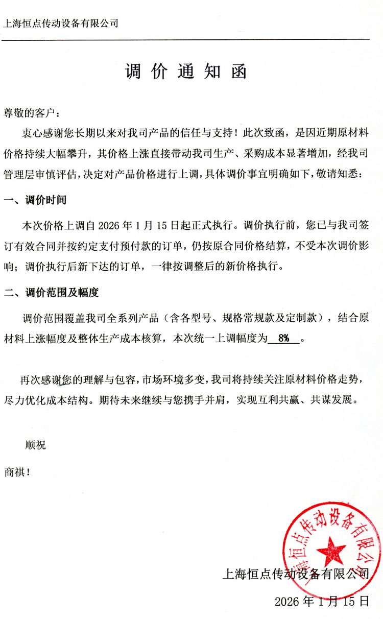本次價格上調自2026年1月15日起正式執行。調價執行前,您已與我司簽訂有效合同並(bìng)按約定支付預付款的訂單,仍按原合同價格結算,不受本次調價影響;調價執行後新下達(dá)的訂單,一律按調整後的新價格執行。