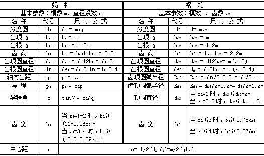 蝸杆蝸輪的主要參數有:模數m、蝸杆分度圓直徑d、導程角γ、、中心距a、蝸杆頭數z1、蝸輪齒數z2等 ,根據上述參(cān)數可決定蝸杆與蝸輪的基本尺寸,其中z1、z2由傳(chuán)動要求選定。幾何尺寸計算如下表所示。