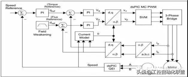 許多芯片MCU,MPU廠商都給出瞭(le)變(biàn)頻矢量控制的框圖和算法庫,有興趣的可以研究研究,例如下圖爲微芯科技(Microchip)給出的框圖