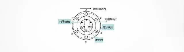 由於(yú)旋轉磁場不斷切割轉子中的閉合導體 ,産生感應電動勢和感應電流,再由轉子中的感應電流和旋轉磁場的相互作用産生電磁轉矩 ,使得轉子随著(zhe)旋轉磁場的方向同向運轉。比如籠型異步電動機,由於(yú)旋轉磁場順時針切割轉子導體 ,相當於(yú)導體逆時針轉動,運用右手定則 ,讓磁感線垂直穿過手心,拇指指向導體的運動方向,四指的方向就是感應電流的方向(如圖4所示籠型異步電動機轉子繞組電流的方向),然後應用左手定則,磁感線穿過手心,四指指向電流運動方向,大拇指方向即爲轉子受到電磁力的方向(如圖所示電磁轉矩矩T方向),在電磁力的作用下形成電磁轉矩,拖動轉子順著(zhe)旋轉磁場的方向轉動。