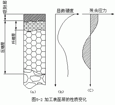 表面層的物理力學性能包括表面層的加工硬化、殘餘應力和表面層的金相組織變化。機械零件在加工中由於受切削力和熱的綜合作用,表面層金屬的物理力學性能相對於基本金屬的物理力學性能發生瞭(le)變化。圖 5— 2a所示爲零件表面層沿深度方向的變化。最外層生成有氧化膜或其他化合物,並(bìng)吸收 、滲進氣體粒子,稱爲吸附層。吸附層下是壓縮層,它是由於切削力的作用造成的塑性變形區,其上部是由於刀具的擠壓摩擦而産生的纖維層。切削熱的作用也會使工件表面層材料産生相變及晶粒大小變化。