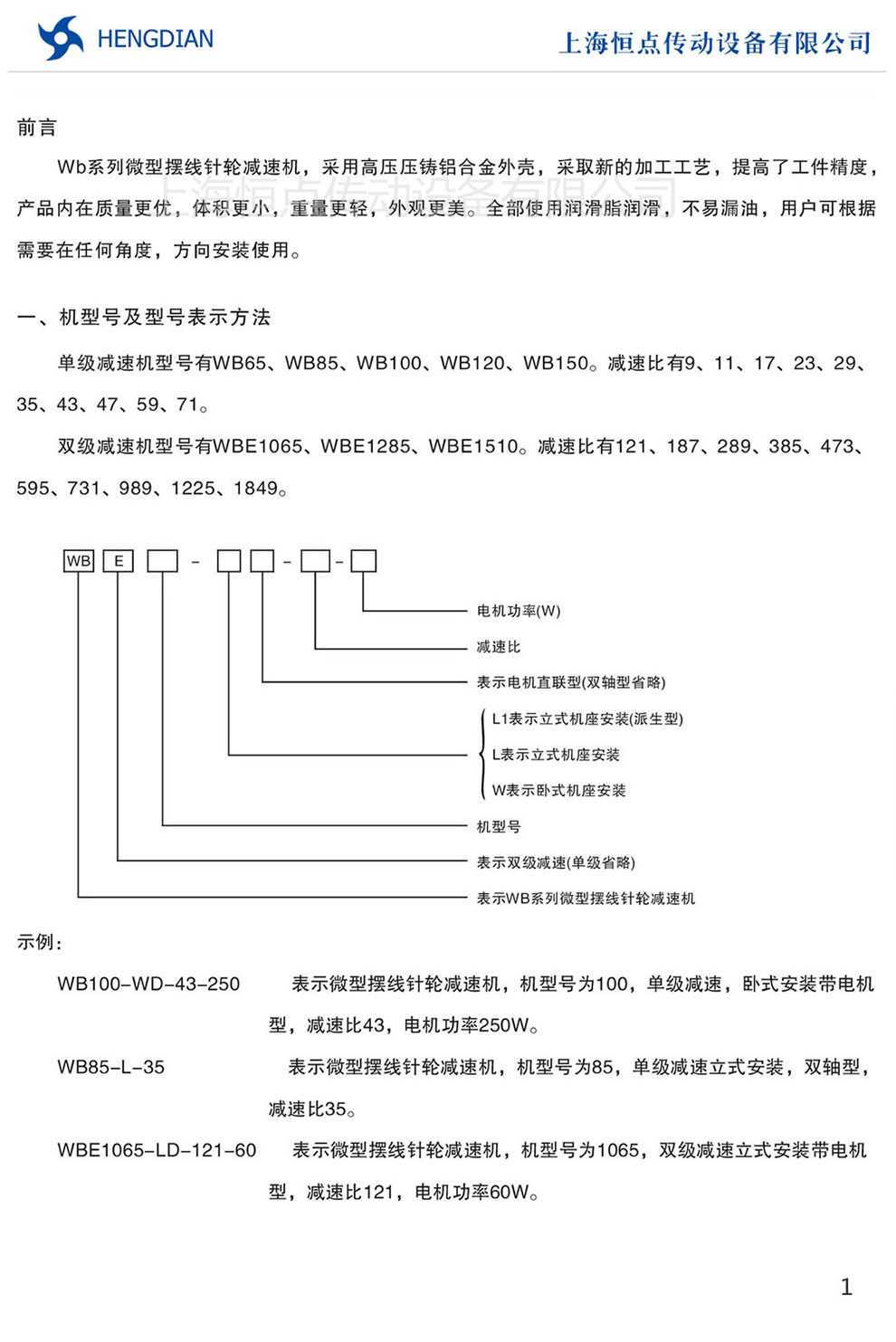 1 - WB擺(bǎi)線減速機(jī)的型号表示方法 2 - WB微型擺線減速機的選型表