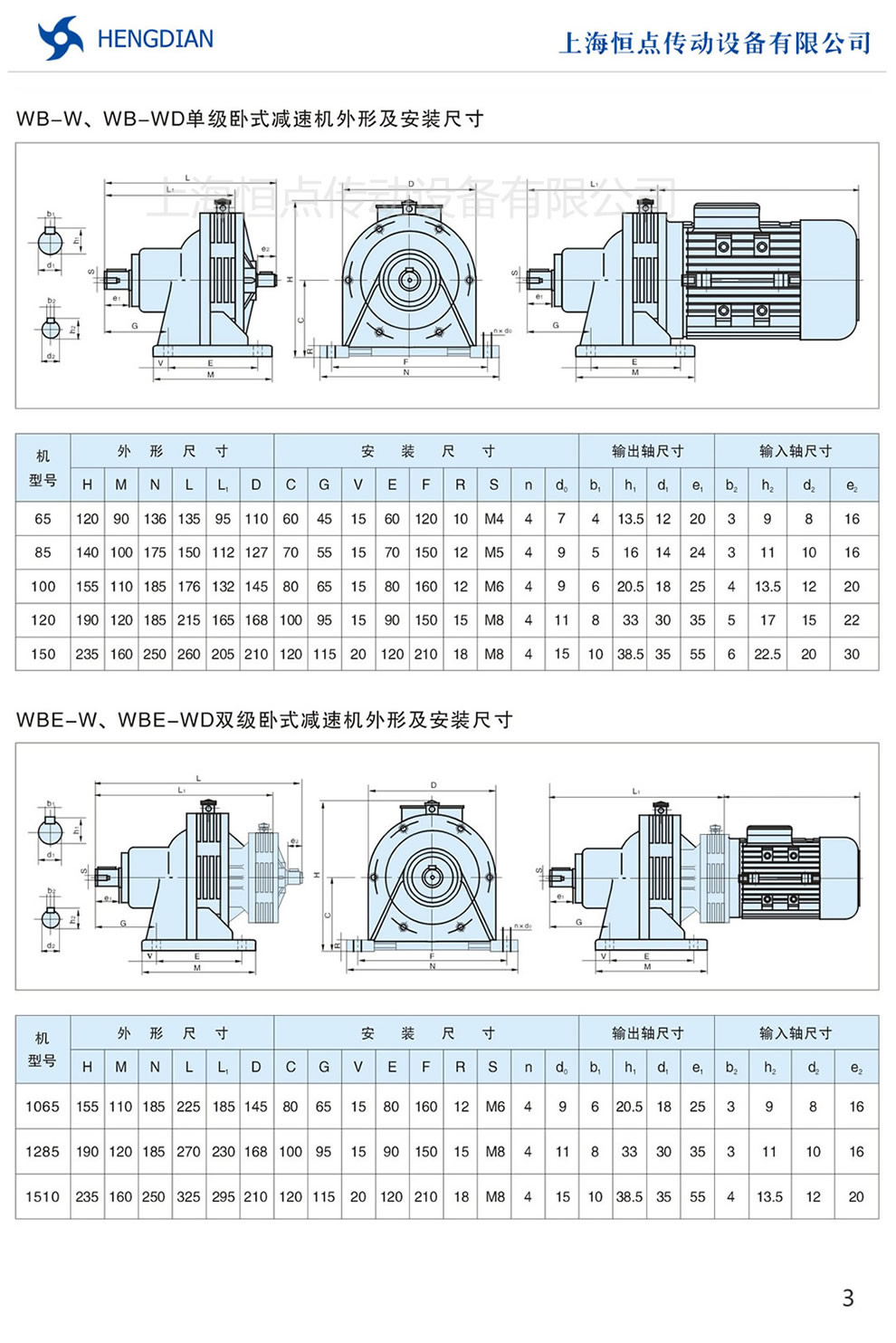 3 - WB擺(bǎi)線減速機的單(dān)級和雙級卧式外形及安裝尺寸 4 - WB擺線減速機的單級和雙級立式外形及安裝尺寸