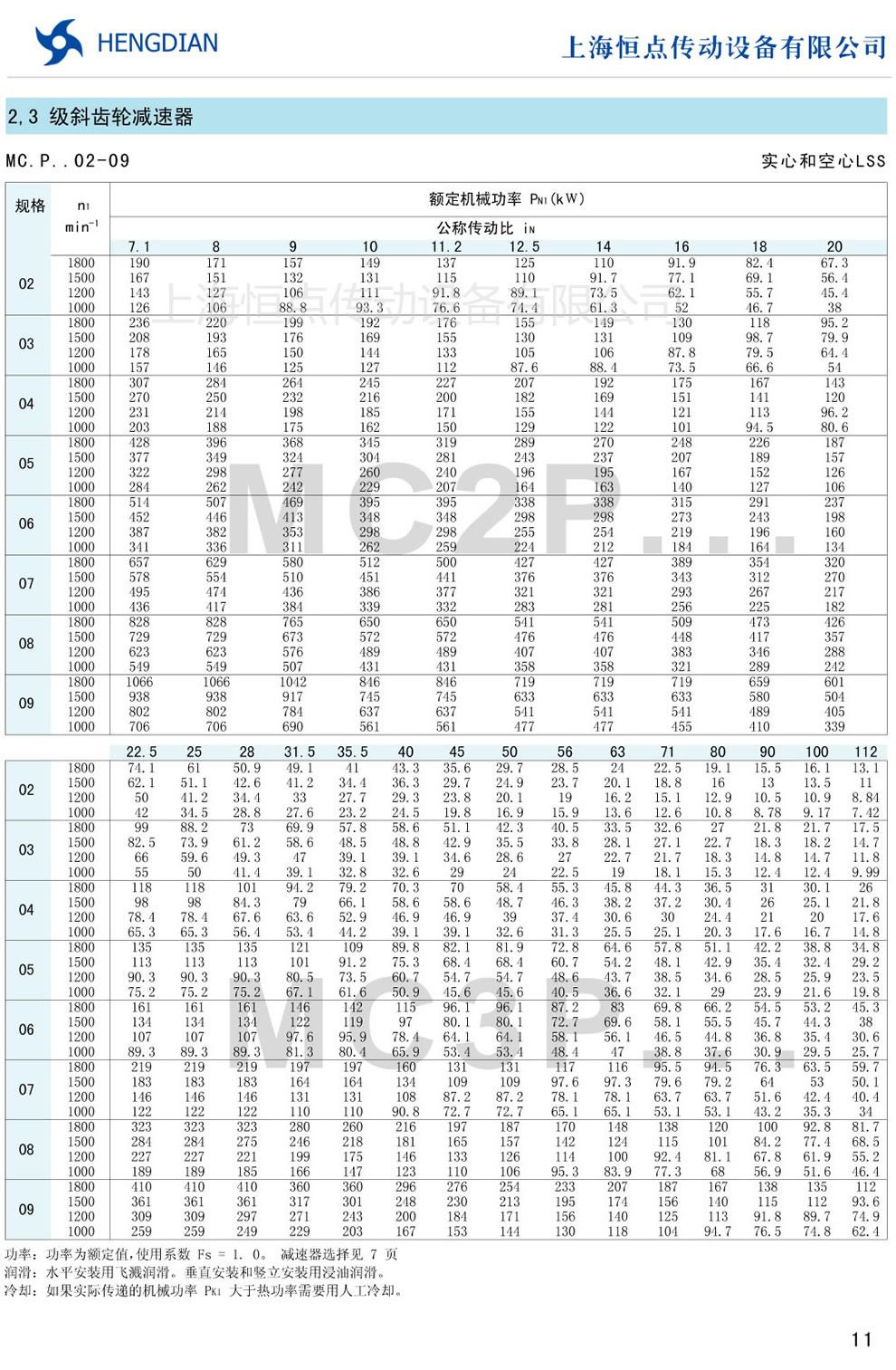 9 - 傳動能力和外型安裝尺寸/斜齒豎立安裝 10 - 傳動能力和外型安裝尺寸/錐齒-斜齒水平安裝
