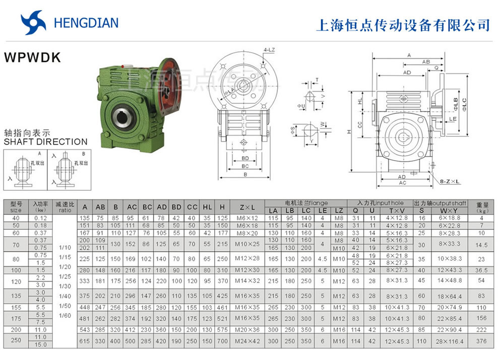 WPWDK萬能型減速機的外形尺寸及安裝尺寸.WPWDK萬能型減速機軸輸入,軸輸出.WPWDK系列蝸輪蝸杆減速機選型指南,WPWDK萬能型減速機軸指向表示方法.機座号40到250,速比10到60.