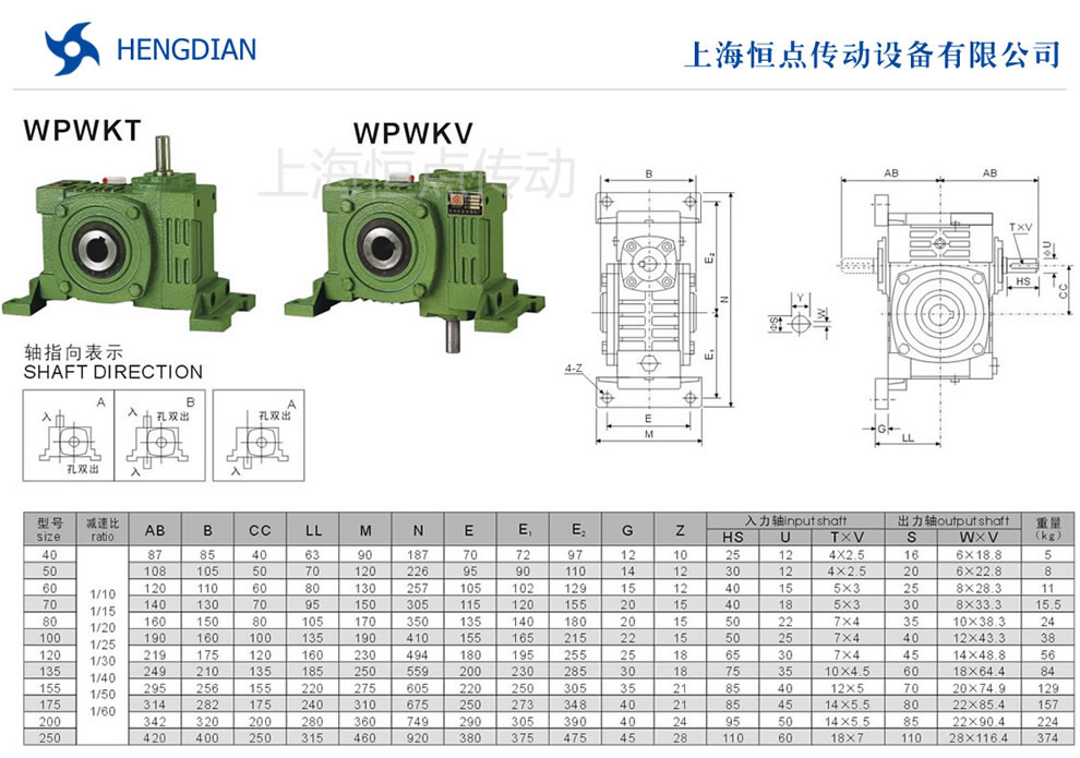 選型指南,WPWKT與WPWKV萬能型減速機軸輸入,孔輸出.WPWKT與WPWKV減速機的外形安裝尺寸.WPWKT與WPWKV萬能型減速機軸指向表示方法.機座号40到250,速比10到60.